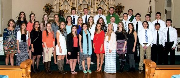 Parishioners from the Vincennes area parishes gather for a photograph after their Confirmation. They include, front row, Sophia Lane, Erica Johnson, Lyndsey Johnson, Jessica Primus, Anna Donovan, Taylor Buck, Hannah Greenwood, Sydney Leonard, Madison Hall, Ann Wild, Abigail Wissel, Aaron Preusz, Jillian Banzon, Nathan Miller, second row, Megan Herman, Gabi Hancock, Isabella Finch, Shelby Stocker, Madeline Halter, Natalie Niehaus, Victoria DeBrock, Karlye Vonderwell, Tanner Morrison, Ashton Primus, Thomas Vieck, Nick Miller, Jacob Anderson, third row, Father Pascal Nduka, Abe Ramsey, Jack Cunningham, Ben Templin, Father Dave Fleck and Deacon Cletus Yochum.