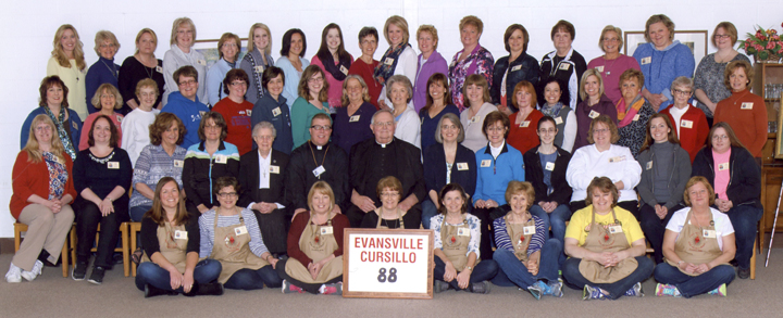 Participants in the Women’s Cursillo Weekend 88 include, front row, Brenda Meredith, Brenda Martin, Robin Dugan, Carol Smith, Allyson Goth, Norma Folz, Peg Hardesty, Cindy Smith, second row, Charlene Urbancic, Laurel Castilla, Kathy Fulkerson, Jenny Barry, Sister Beata Mehling, Father Gary Kaiser, Father William Dietsch, Elaine Morris, Annalee Wilson, Beth Funk, Carol Ann Gaddis, Kim Engbers, Lisa Griffin, third row, Linda Ketzner, Connie Gray, Mary Jo Marks, Susan J. Weber, Maryann Dunbar, Lois E. Curtis, Mary Payne, Susie Schapker, Bev Conner, Gretchen Miller, Donna Hurm, Mary Colvin, Bethany Logan, Jodi Fehrenbacher, Nancy Miller, Charlene Lamey, Jonette Wilson, fourth row, Allison Kaiser, Terri Barnes, Dana Thyen, Brenda Ferguson, Kay Tornatta, Laura Sherman, Amy Decker, Kelly Tretter, Donna Dilger, Alicia Nichols, Diane Bemis, Monica Wayman, Amy Kissel, Dianne Klein, Kathy Pfister, Angie Mitchell and Belinda Rennie.