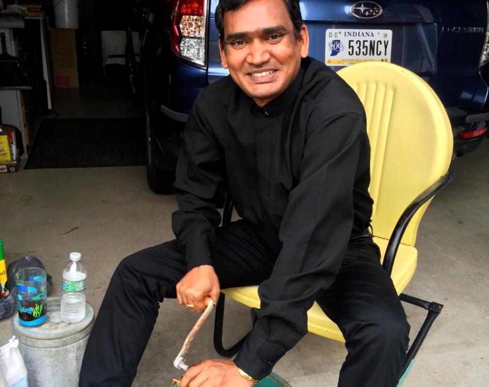 Father Simon Natha, associate pastor of Evansville’s St. Boniface Parish, recently tried his hand at making vanilla ice cream during a visit to the home of Jerry and Helen Weinzapfel.