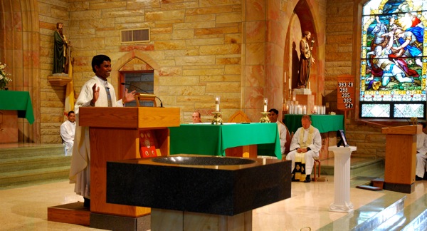 Father Sudhakar Bhastati, associate pastor of Sts. Peter and Paul Parish in Haubstadt, Holy Cross Parish in Fort Branch and St. Bernard Parish in Snake Run, discusses his late father, Joakim, during an Aug. 3 memorial Mass at Sts. Peter and Paul. Joachim Bhastati died June 23 in India with Fahter Sudhakar and the rest of his family at his side.