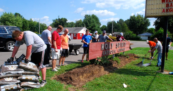 The group spent the afternoon of Aug. 13 with Director of Vocations Father Alex Zenthoefer and Assistant Director Father Jason Gries completing a number of projects at Annunciation Parish’s Holy Spirit Campus, including major landscaping work at the main entrance along Lodge Ave.
