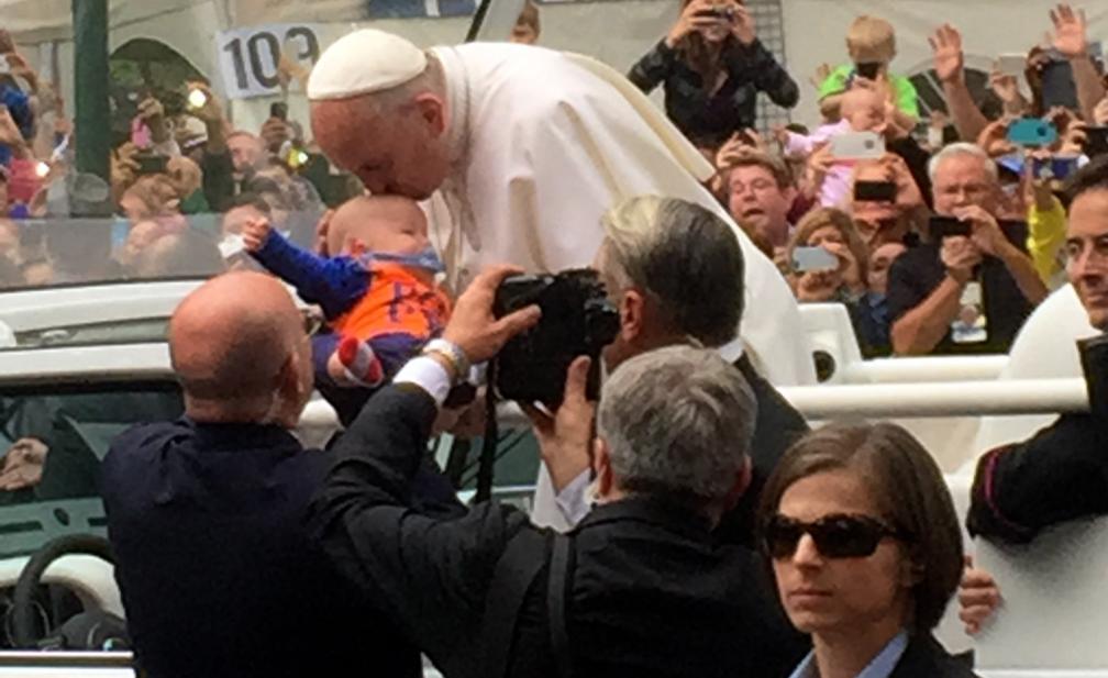 As the southern Indiana group was watching the pope mobile approach, Bowman held Reese out, not above her. A secret service agent grabbed him and walked him over to the pope. The baby was lifted up to the pope, who bent down and kissed him. “It was so tender and sweet,” Bowman recalled.