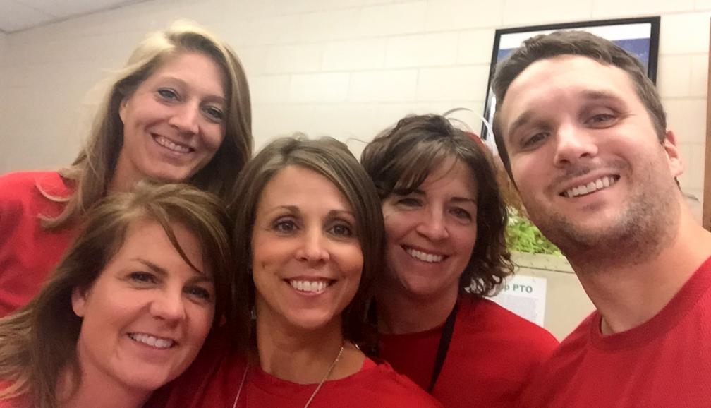 Five members of the St. Philip School staff – including teacher Carrie Boehman, top left, aid Lisa Weber, bottom left, secretary Jule McGrew, principal Andrea Dickel and Kirkman – donned their race T-shirts for the photo.