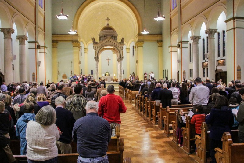 Many of the 76 catechumens and 90 candidates in the Rite of Christian Initiation for Adults across the Diocese of Evansville braved a blast of winter weather on Feb. 14 with their sponsors and families to participate in the annual Rite of Election, which was held at St. Benedict Cathedral in Evansville.