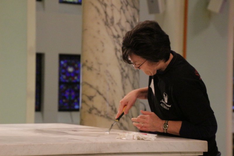 St. Benedict Cathedral parishioner Beth Folz scrapes the top of the marble altar before it is steam-cleaned on March 12 during the 2016 Saint Meinrad Day of Service in Evansville. Saint Meinrad alumni coordinated similar events in locations across the country. The Evansville volunteers focused their efforts on St. Benedict Cathedral. In addition to steam-cleaning the marble in the sanctuary, they cleaned all of the woodwork with oil soap; painted the sacristy; and completed multiple small landscaping projects on the grounds. Saint Meinrad Director of Planned Giving Darren Sroufe, an alumnus coordinated the Evansville Day of Service and led the group in Morning Prayer before they began their workday.
