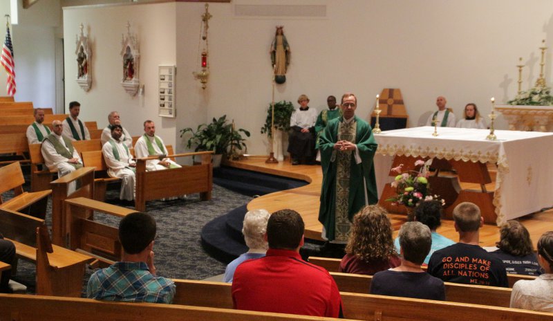 Bishop Charles C. Thompson speaks to approximately 30 young people who attended the annual Picnic with the Bishop event organized by the Diocesan Office of Vocations. St. John the Evangelist Parish in Daylight hosted the May 25 event, which included dinner, presentations and games. Also shown in this photo are other priests who participated, including Director of Vocations Father Alex Zentoeher, sitting behind Bishop Thompson, who concelebrated Mass. Seated at left are Father Sudhakar Bhastati and Father Jeff Read, front pew, Father Steve Gallegos, chaplain of the Daughters of Charity Seton Residence, and Father Eugene Schmitt, middle pew, and Father Tony Ernst and Father Chris Forler, back pew. Members of orders of religious women also attended and participated.
