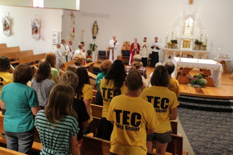 Bishop Charles C. Thompson, on the altar in red vestments, and several priests of the Diocese of Evansville concelebrated Mass on Sept. 24 to recognize the 25th anniversary of Teens Encounter Christ retreats in the diocese. St. John the Evangelist Parish in Daylight hosted the Mass. Concelebrants included Father Bernie Etienne, pastor of Holy Rosary Parish in Evansville and Diocesan Vicar General; Father Jack Durchholz, pastor of St. Ferdinand Parish in Ferdinand and St. Henty Parish in St. Henry; Father Zach Etienne, pastor of Good Shepherd Parish in Evansville; Father Dave Fleck, pastor of St. Francis Xavier Parish in Vincennes and Dean of the diocese’s North Deanery; and Father Lowell Will, pastor of St. Clement Parish in Boonville. Deacon Joesph Siewers assisted. Bishop Thompson noted that the diocese has hosted 95 TEC retreats to date. He also talked about many conversations he has had with those called to religious life. “I often hear that the seeds of their vocations were planted in their families, and in their schools,” Bishop Thompson said. “But what moved them to respond to the call were their experiences in in TEC and Source Summit. Tec is so powerful because it takes you wherever you are and leads you along.”