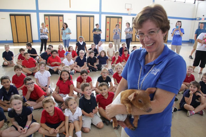 The students got their big rewards on Sept. 21 – the Feast of St. Matthew. A stretch limousine shuttled students a few minutes from school to a local park, where they enjoyed recess and pizza for lunch. After the limo returned them to the school, they gathered in the St. Matthew gym, where Wannemuehler appeared with a week-old piglet from Eisterhold Farms in Poseyville. School parents Benny and Katie Hoehn provided round trip transportation from the farm to the school.
