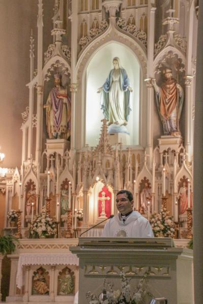 Father Chacko celebrated a midday Mass at St. Mary Church, which was followed by exposition of the Blessed Sacrament that continued until just before the evening Mass. Father “Dusty Burns,” Pastor of Cor0us Christi Parish in Evansville and St. Philip Parish in Posey County, presented a reflection on Fatima and its ongoing relevance before the evening Mass.