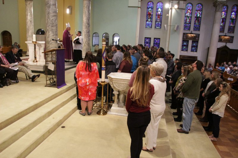 Thirty Parishes from across the diocese presented their Catechumens – those who will be baptized, confirmed and receive the Eucharist during the Easter Vigil – and their Candidates – those who will be confirmed and receive the Eucharist during the Easter Vigil. Their respective sponsors joined them in the presentation at St. Benedict Cathedral in Evansville.