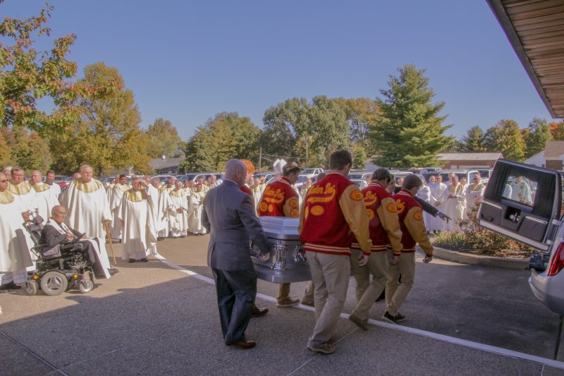 At Father Kreilein’s request, 18 members of Mater Dei’s football team served as pall bearers – six for the opening procession of the Mass of Christian Burial, six for the closing procession, and six for the graveside service, which occurred in his hometown of Jasper. Team captains served and the Resurrection School alumni served.