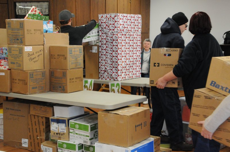 Several long tables in the facility overflowed with the Christmas blessings, which included wrapped gifts for children, laundry detergent, nonperishable food items, cleaning supplies and clothes. Franciscan Sister Jane McConnell explained that each family is identified only by a number to keep personal information confidential.