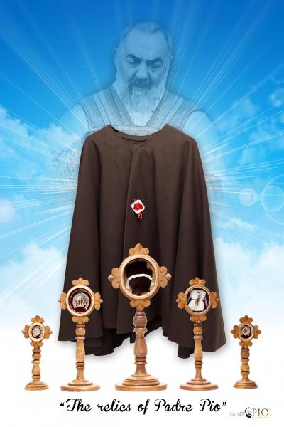 The relics of Saint Pio available for public veneration will include Saint Pio's glove; Saint Pio's crusts of the Stigmata wounds; Cotton gauze with Saint Pio's blood stains; a lock of Saint Pio's hair; Saint Pio's mantle; and Saint Pio's handkerchief , soaked with his sweat from hours before he died.
