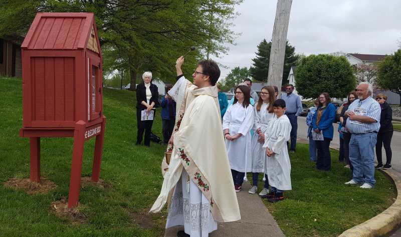Father Brian Emmick, pastor of St. Joseph in Princeton, used holy water to bless the Blessing Box on April 28. It was built and installed by parishioner Joe Collins.