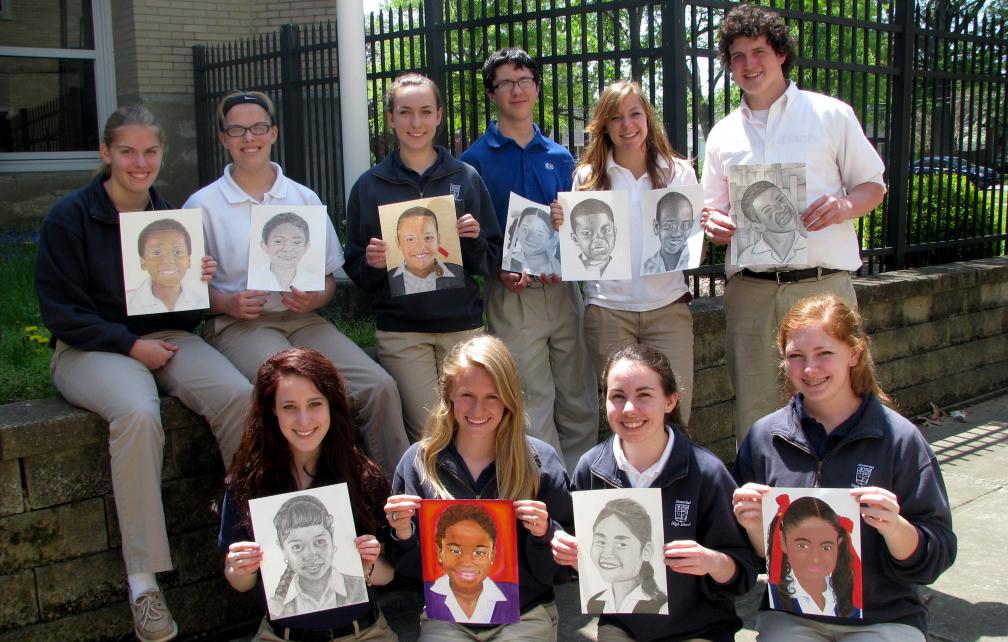 The portraits were completed in paint, pencil and colored pencil, and then sent to the children as gifts. When delivered, the students were photographed with their artwork, and the Art Club received copies of these photographs.