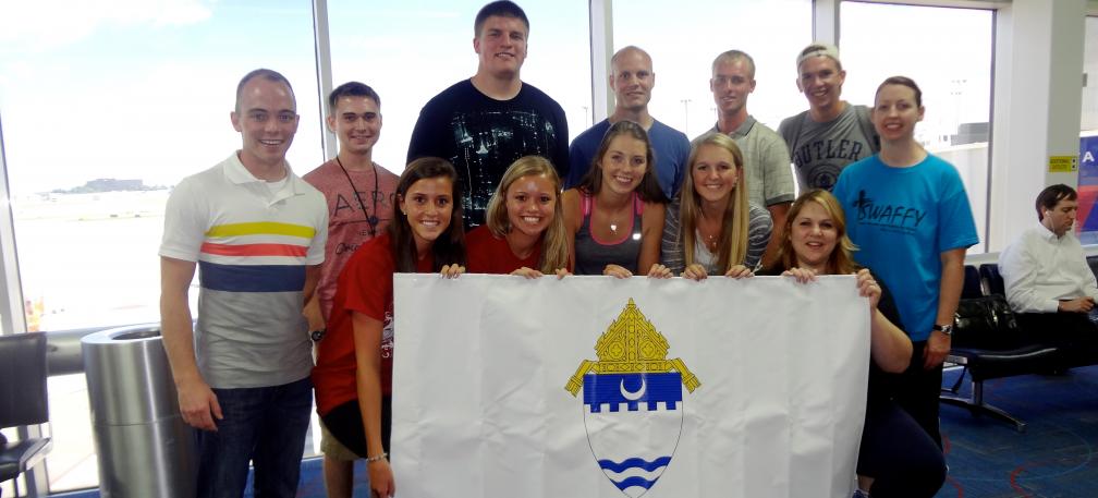 The pilgrims include, from left, Tyler Tenbarge, Kyle Freyberger, Megan Durchholz, Luke Hassler, Megan Baehl, Jenae Gries, Father Christopher Droste, Emily McAtee, Gavin Steckler, Sherie Cooley, Andy Hirsch and Dena Embrey. They represent Christ the King Parish in Evansville, Sts. Peter and Paul Parish in Haubstadt, Holy Cross Parish in Fort Branch, St. Francis Xavier Parish in Poseyville, St. Wendel Parish in St. Wendel, St. Joseph Parish in Jasper, St. Philip Parish in Posey County, and St. Augustine Parish in Leopold.