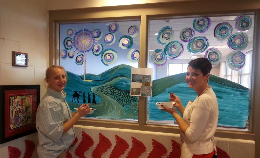 St. Wendel School art teacher Amber Martin and eighth grader Hannah Adler paint a mural of the three Wise men as they travel to Bethlehem.
