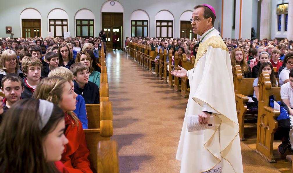 Twenty-eight Catholic communities of faith, knowledge and service from across the Diocese of Evansville came together Jan. 29 at St. Benedict Cathedral for the 2014 National Catholic Schools Week Mass. Bishop Charles M. Thompson welcomed students, faculty, staff and family from all 28 schools in the diocese, and those in attendance were treated to the joyous music of the “Catholic School Choir,” which featured students from every diocesan school and instrumentalists from Reitz Memorial High School, which co-hosted Mass with St. Benedict Catholic School.