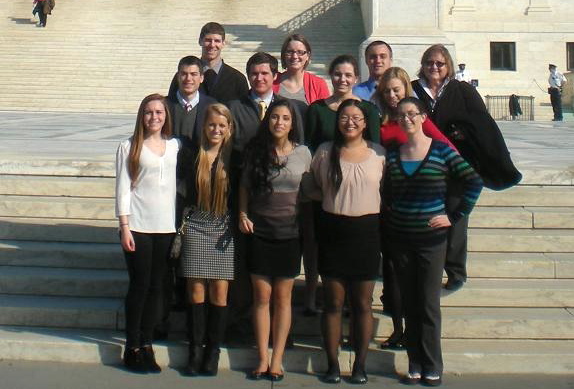 Reitz Memorial High School students gather for a photograph in front of the U.S. Supreme Court building as part of their CLOSE UP visit to Washington, D.C. They include, front row, Katelyn Ettensohn, Lauren Paris, Erica Malitz, Tori Schaefer, Amanda Royer, second row, Ian Pitt, Grant Walker, Anna Zimmerman, Paige Effinger, third row, Aaron Schmitt, teacher, Ellie Hachmeister, Evan Partenheimer and Deborah Eaton, teacher.