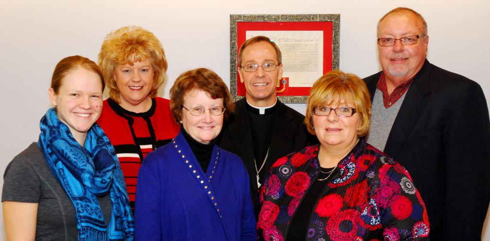 Bishop Charles C. Thompson is joined by members of The Message staff: Anna Schulten, intern; Sheila Barclay, design editor; Mary Ann Hughes, managing editor; Diane Csukas, sales and office coordinator, subscriptions, and Tim Lilley, editor. Bishop Thompson is the publisher of the weekly Catholic newspaper in the Diocese of Evansville.