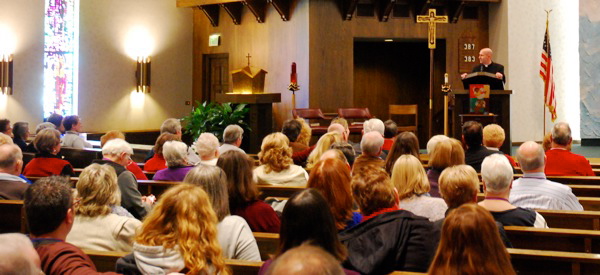 Father Alex Zenthoefer, pastor of Evansville’s Annunciation Parish, delivers the afternoon keynote on Feb. 27 during Holy Rosary Parish’s annual Faith Day event.