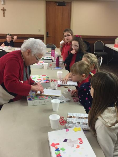 The group completes multiple service projects throughout the year, which include creating birthday cards and Christmas ornaments for sick and elderly parishioners, Operation Christmas Child shoeboxes, First Communion photo frames and hand-tied quilts.