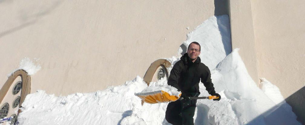 At a Sunday morning Mass, the church announced the need for help removing snow from the building because of the unique shape of the church.