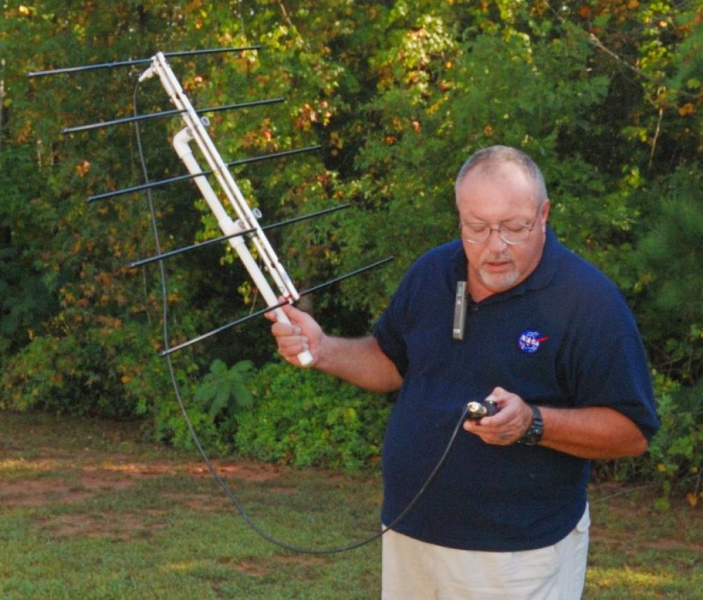 The picture shows me in my Athens, Georgia, back yard in 2008 with the complete satellite station I used for a couple of those ISS contacts. Seriously – it consists of a handheld radio that operates on VHF and UHF frequencies, and a directional antenna that I literally pointed at the sky as the ISS passed over.