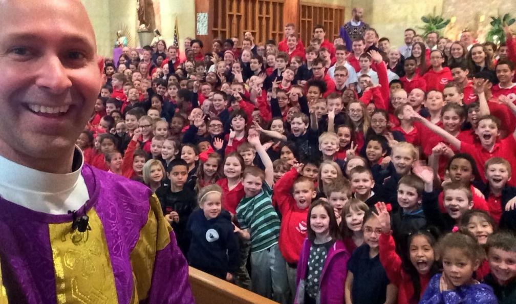 Father Alex Zenthoefer, pastor of Annunciation of the Lord Parish in Evansville, shot this selfie with the combined student body of the parish’s Christ the King and Holy Spirit school campuses at Holy Spirit on March 12. Father Zentohoefer celebrated Mass for the entire school.
