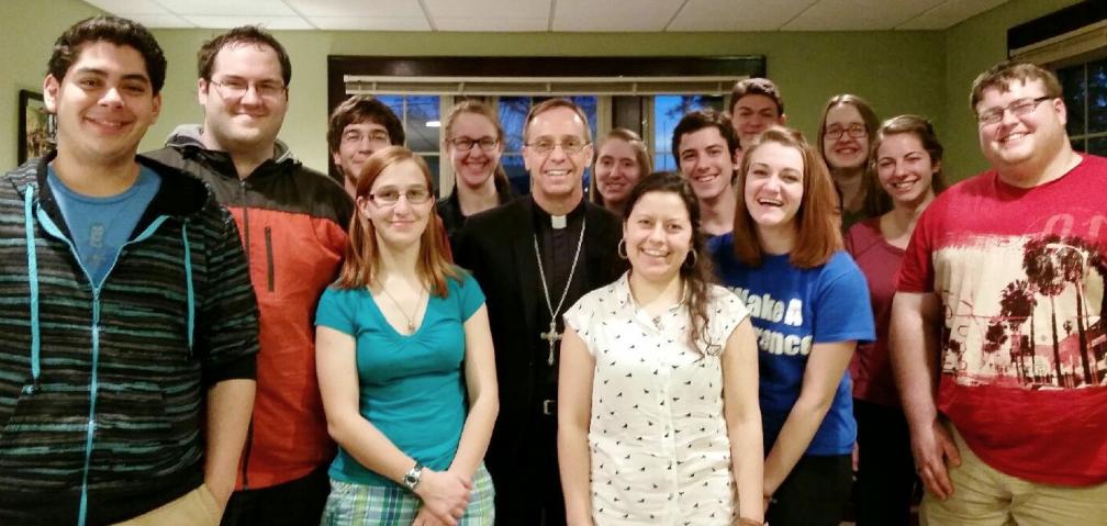 University of Evansville students enjoyed dinner with Bishop Charles C. Thompson on March 16 at the UE Newman Center. Enjoying their evening with Bishop Thompson are Oscar Gomez, front row left, Brad Phillips, Katie Ziebell, Fran Prexl, Cecelia Cottrill and Nathan Sterling. Also Joshua Best, back row left, Anna Kalt, Alanna Payne, Scott Grady, Isaiah Frey, Maria David and Becca Gervasio.