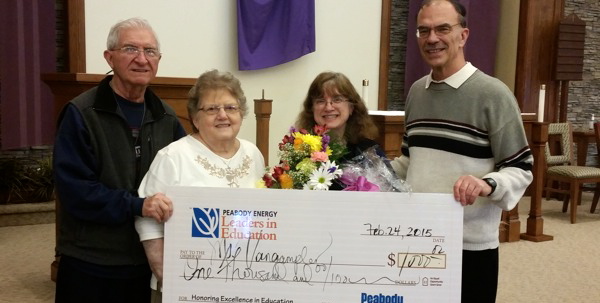 Resurrection teacher Jennifer Vangampler displays a check that she received as part of the Peabody Energy Leader in Education award.