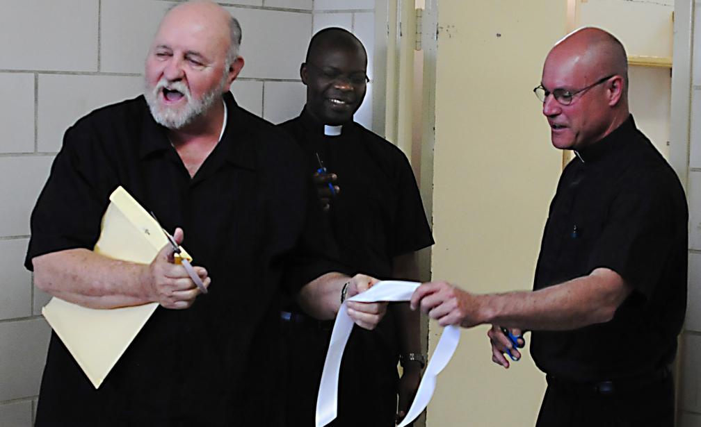 Father Henry Kuykendall, who retired as pastor of Nativity at the end of 2014, joined pastor Father Bernie Etienne and Associate Pastor Father Crispine Adongo for the ribbon-cutting ceremony to open the food pantry.