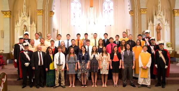 Twenty-one ninth graders were confirmed by Bishop Charles C. Thompson during the 10:30 a.m. Mass on April 26 at St. John the Evangelist Parish in Loogootee. Above are, front row, Bruce Hawkins, Darin Holder, Jane Holder, Zachary Lythgoe, Katie Sims, Taiya Armstrong, Cora Hedrick, Heather Harshaw, Haley Burch, Bryan Scott Noble, Jr., Conner Hedrick, Don Bowling, second row, Mark Sims, Father Kenneth Walker, pastor, Mike Ringwald, Paula Ringwald, Marina Lents, Carson Rayhill, Corbin Henninger, Jody Seals, Jayden Wagoner, Savannah McAtee, Kaylin Harris, Mike Staab, third row, Jeff Crew, Noel Harty, Deacon William Consley, Christopher Hager, Luke Callison, Dylan Arthur, Aaron Lents, Justin Clark, Brandon Eckerle, Brandon Armstrong Patrick Allbright, Jamison Hennette, Sean Lents and Mark Trout.