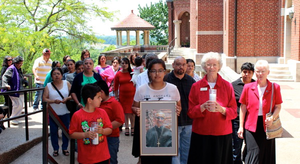 Francisca Rivas, center, of Huntingburg and Benedictine Sisters Betty Drewes and Joan Scheller lead a procession into Monastery Immaculate Conception Church in Ferdinand prior to a Mass of Commemoration for slain Salvadoran Archbishop Oscar Romero. Rivas carries a photo of Archbishop Romero, who was her great-grandfather's brother. Archbishop Romero, who spoke out against poverty, social injustice and torture during his country's civil war, was killed while celebrating Mass in 1980 in San Salvador. In 1997, Pope John Paul II bestowed the title “Servant of God” on him, and a cause for beatification and canonization was opened. He was declared a martyr by Pope Francis on Feb. 3, 2015, and his beatification took place on May 23.