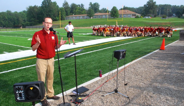 Mater Dei High School President Timothy "Tad" Dickel speaks to the Wildcats football team and coaches, and a large crowd that joined them on Aug. 8 for the dedication of Boots Baumann field on the Evansville campus.