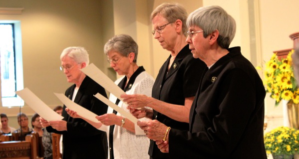 Benedictine Sisters Donna Marie Herr, left, Agnes Weinzapfel, Jane Becker and Eileen Reckelhoff renew their monastic vows on Aug. 22 during their Golden Jubilee Mass at Monastery Immaculate Conception in Ferdinand.