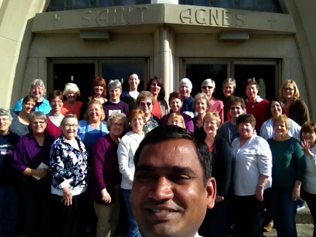 Father Simon Natha, front, associate pastor of St. Boniface Parish in Evansville, shot this selfie with women who participated in the Nov. 14-15 “Christ Renews His Parish” weekend, which was held on the campus of St. Agnes Church.