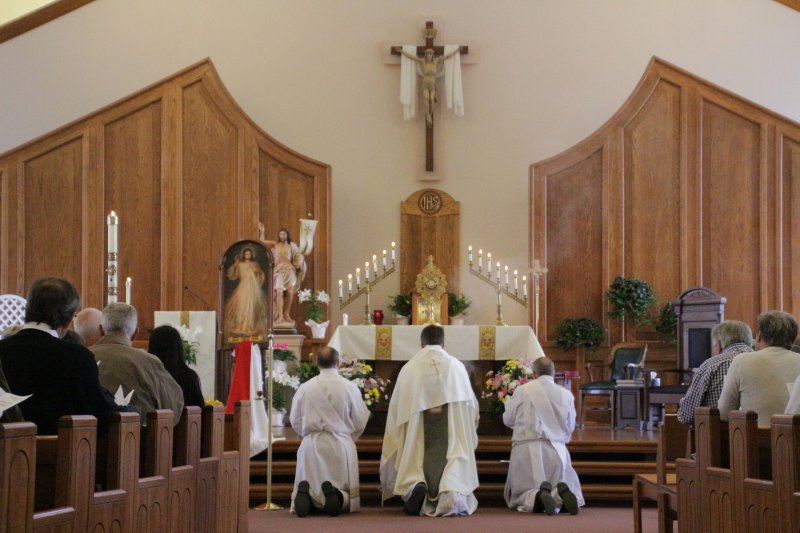 Father Claude Burns, center, pastor of St. Philip Parish in Posey County and Corpus Christi Parish in Evansville, censes the altar and the Blessed Sacrament at St. Philip Church during the Divine Mercy Sunday service the parish hosted on April 3. Deacon Charlie Koressel, left, and Deacon Tom Kirsch, kneel with Father Burns and assisted during the service. Four priests of the Diocese of Evansville heard personal confessions, and attendees prayed the Chaplet of St. Michael, the Divine Mercy Chaplet, the Glorious Mysteries of the Rosary and the Litany of Divine Mercy. Divine Mercy services also were celebrated at St. Celestine Parish in Celestine, St. Martin I Parish in Chrisney, Holy Cross Parish in Fort Branch and St John the Baptist Parish in Newburgh.