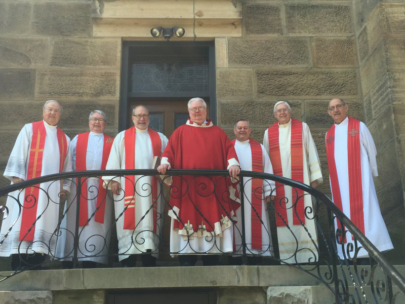 Father William Traylor, center, associate pastor of St. Joseph Parish in Jasper, is celebrating the 40th anniversary of his priestly ordination this year. He was ordained to the priesthood on April 30, 1976. Joining him to concelebrate Mass on May 15 – Pentecost Sunday – in honor of his anniversary are Father Joseph Ziliak, left, Father Mike Madden, Father Dave Martin, St. Joseph Pastor Father Ray Brenner, Father Steve Lintzenich and Father David Nunning. Father Martin also celebrates his 40th anniversary this year. He was ordained to the priesthood on May 14, 1976. He and Fathers Ziliak, Madden, Lintzenich and Nunning are retired priests of the Diocese of Evansville.