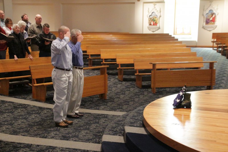 Veterans George Brunner, left, and Don Gillies salute during the opening procession of the Nov. 11, 2015, Boots Mass honoring veterans. St. John the Evangelist Parish in Daylight hosted the Mass. Gillies has notified The Message that the parish will host a Boots Mass at 10 a.m. on May 29, over Memorial Day weekend. All are welcome to attend. Items placed at the altar to recognize the sacrifice of American men and women include a pair of GI boots, a set of dog tags, a miniature POW-MIA flag and an American flag.