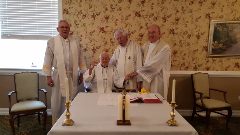 Father August Busch, seated, retired priest of the Diocese of Evansville, enjoys time with brother priests Father Kenneth Betz, left, Father Ted Tempel and Father Joseph Ziliak, all retired priests of the Diocese of Evansville. They joined Father Busch to concelebrate Mass in honor of his 60th anniversary as a priest. Father Busch was ordained to the priesthood on May 26, 1956. He now resides at The Protestant Home in Evansville.