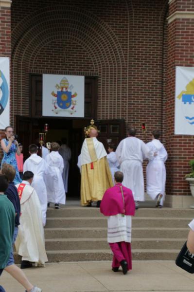 Bishop Charles C. Thompson, in red, follows Father Alex Zenthoefer, pastor of Annunciation Parish in Evansville and Diocesan Director of Vocations, who carries the Blessed Sacrament through the Holy Door at St. Benedict Cathedral during the May 29 Corpus Christi Procession from Annunciation’s Christ the King Church to the Cathedral.