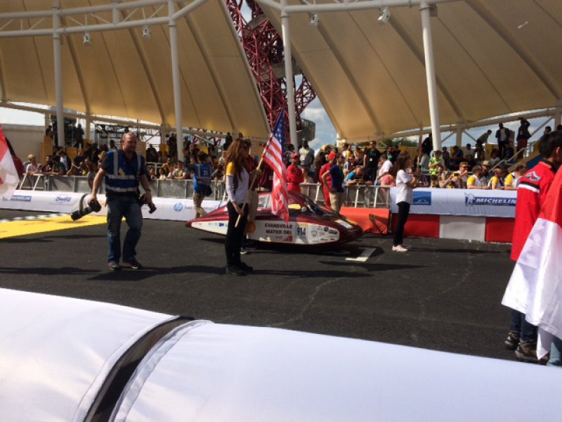 Mater Dei High School’s Supermileage Team recently traveled to London, England, for the Drivers World Championship, a competition sponsored by Shell. More than 200 teams competed in an overall challenge and in classifications based on design. Mater Dei finished first among teams using combustion engines and fourth overall! During the competition, they had a chance to meet and visit with Formula 1 driver Kimi Raikkonen of Team Scuderia Ferrari, who is shown talking to the team in a June 29 visit to the competition. The team photo includes driver Grant Weiss, kneeling in front of the car, advisor Dan Ritter, standing at left, team members Drew Henderson, Jacob Schapker, Joe Memmer, Wade Wilmes, Grace Cox and Mitchell Heim, and advisors David Weiss and Bob Neisen. In the third photo, team crew members Wilmes and Heim push Weiss, in the car, into position for a qualifying run. The fourth photo shows the starting grid for the final race. As is customary in Formula 1 competition, each car in the final race was represented by a flag bearer with their nation's flag.