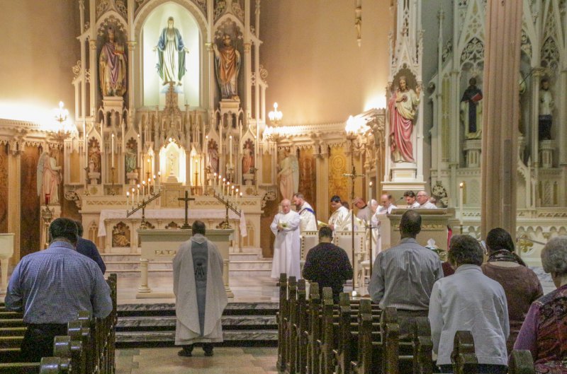 On Oct. 13 – the 99th anniversary of the Miracle of the Sun in Fatima, Father Gordon Mann and five brother priests of the diocese led Eucharistic adoration and concelebrated Mass at the St. Mary Campus of Sts. Mary and John Parish in Evansville to complete a preparation for Total Consecration. Those in attendance joined Father Mann, pastor of Sts. Mary and John, and his brother priests in praying the Prayer of Total Consecration at the conclusion of Mass.