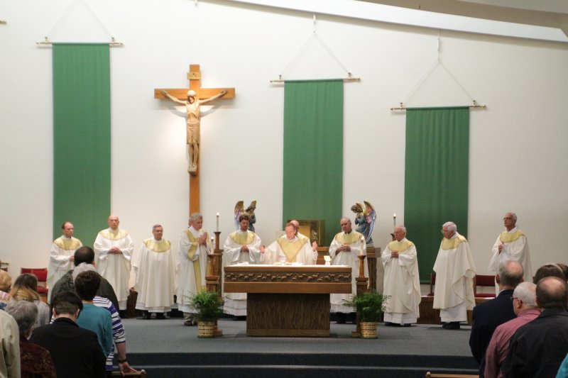 Bishop Thompson concelebrated Mass with 10 priests of the Diocese of Evansville, including Father Ray Brenner, Father Bernie Etienne, Father Zach Etienne, Father Chris Forler, Father Phil Kreilein, Father Eugene Schmitt, Father Ed Schnur, Father Ted Tempel, Father Tyler Tenbarge and Father Lowell Will.