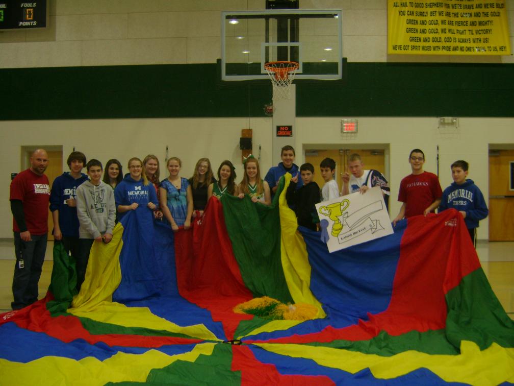 Good Shepherd started Catholic Schools Week with a kick-off assembly to "Raise the Roof" for Catholic Schools and Riley Children's Hospital. They held a Casual Dress Day for $1.00 and raised $370 to help the diocese become a Miracle Docese for Riley. Mr. Carey's 8th grade homeroom won the competition of grades during the assembly. The classes also held a door decorating contest.
