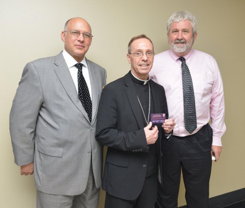 Most Rev. Charles C. Thompson, center, holds the lifetime membership card from the Knights of Columbus that he received following the July 6 Mass of Thanksgiving at St. Benedict Cathedral in Evansville. Faithful Navigator Sir Grant Gerling, left, of the Monsignor A.J. Sprigler Assembly 253 of the 4th Degree Knight of Columbus, joins Mark Hackert, Grand Knight of St. Benedict Cathedral Council 7544, in making the presentation.