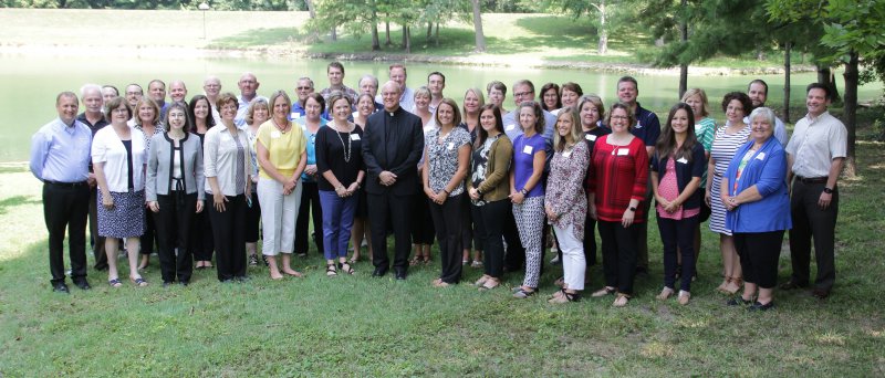 Administrators from the Diocese of Evansville’s 26 Catholic schools join diocesan directors, the Catholic Schools Office staff and staff from the Indiana Non-Public Education Association for this photo on July 18 in New Harmony. The Catholic Schools Office holds this annual retreat in preparation for the start of the new school year, which is approaching rapidly. A schedule of school opening days is posted under the Special Features section of The Message Online.