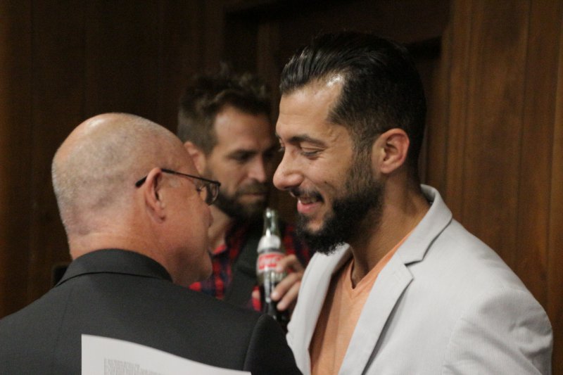 Diocese of Evansville Administrator Father Bernie Etienne visits with Omar Atia of the Evansville Islamic Society before an Aug. 29 press conference in Neu Chapel at the University of Evansville. Leaders from the area’s diverse faith community gathered to formally present a statement rejecting racism, bigotry and hated in light of recent events in Charlottesville, Va., and elsewhere. Look for complete coverage of the event in the Sept. 8 issue of The Message.