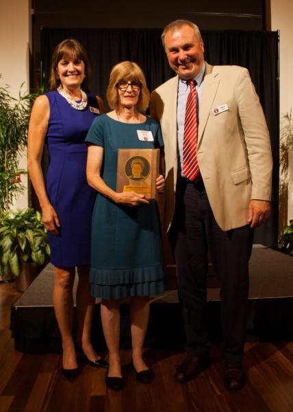 Mater Dei High School girls track coach Roseann Wilson, center, stands with I Association Board Member Ann Bastianelli, left and I Association Board Chair Mark Deal during the Sept. 15 ceremony in Indiana University’s Henke Hall of Champions in Bloomington. Wilson received the Leanne Grotke Award, which is bestowed on living persons whose service has made exceptionally outstanding contributions to Indiana University’s women’s athletics program. It is the highest honor of its kind given by the university.